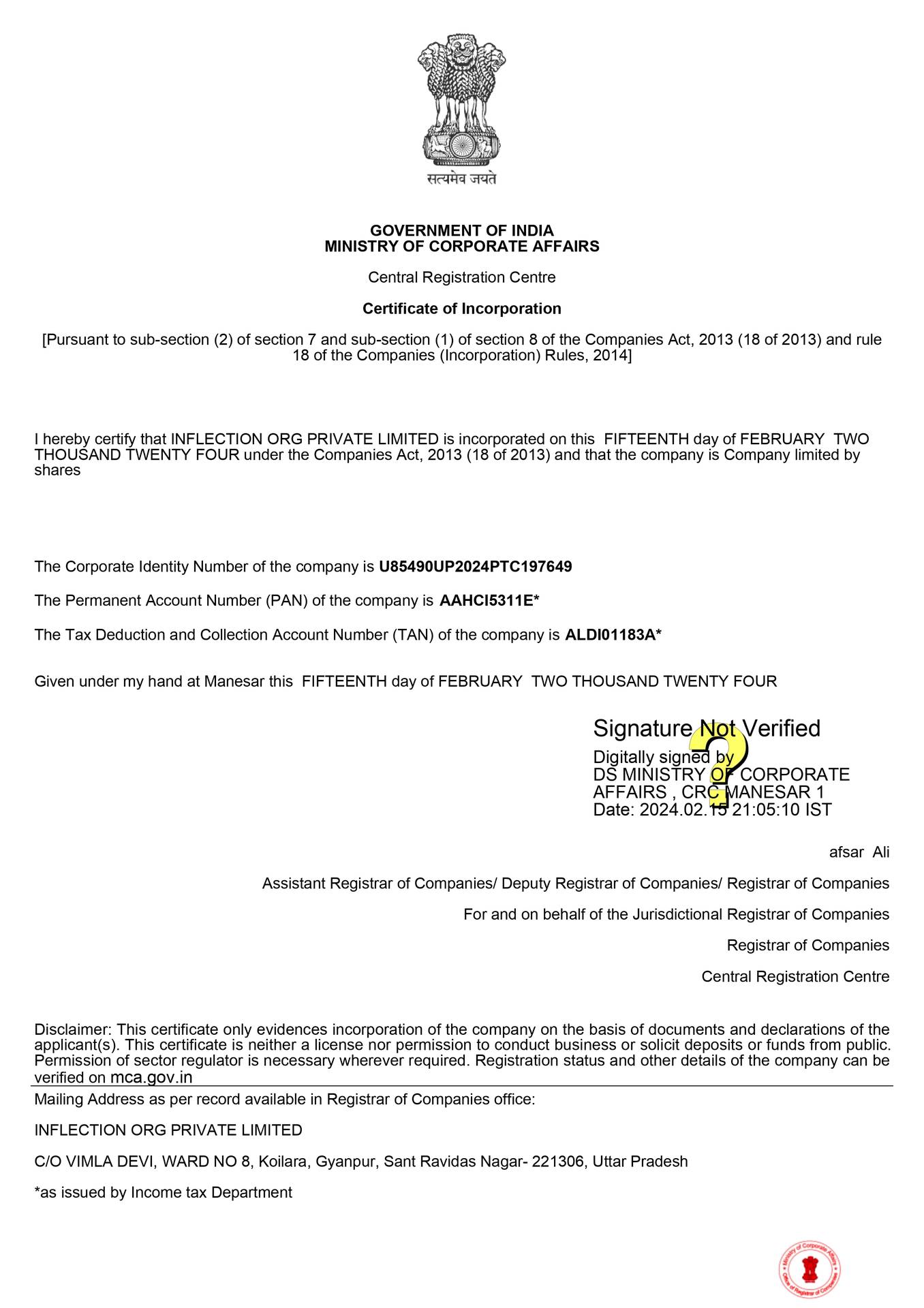 "Officially incorporated as Inflection Org Private Limited under the Companies Act, ensuring legal compliance."